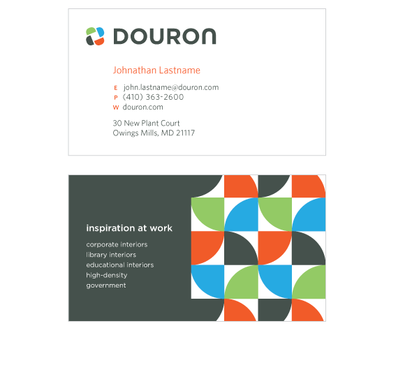 The front of this card is stripped down to the Douron logo and the essential information. The typeface used here is understated and modern, letting the logo take the stage. The back of the card showcases the tagline and services, as well as an energetic pattern based on the geometries of the mark. The bright, lively pattern alludes to the creative solutions and interiors Douron routinely provides for its clients.