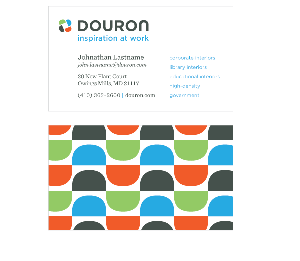 This concept moves all the information onto the front of the card: logo, tagline, services, and contact information. The typeface used on the card is a modern slab-serif designed to complement the typography in the logo and tagline. With all the information on the front, the back of the card becomes a stage for an auspicious, colorful pattern created from pieces of the Douron mark. Bright patterns position Douron as modern, competent company with an eye for design.