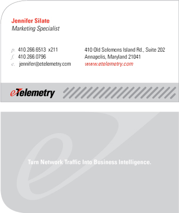 Standard business card with one rounded corner following curve of the "e" | Linear graphic is a colored emboss | full color side has protective varnish coat