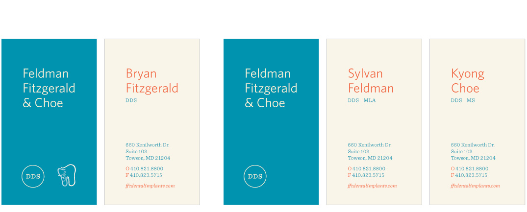 The cards are printed on a cover-weight, off-white paper. The info side contains the physician's name and contact information. The reverse side is a flood of color, interrupted only by the logo and the DDS, neatly set-off in a "seal" type format. The color palette is simple and bright, welcoming and professional. The tight relationship between the physician's name on the back of the card and the logotype on the front of the card is representative of the relationship shared by a physician and his patient.