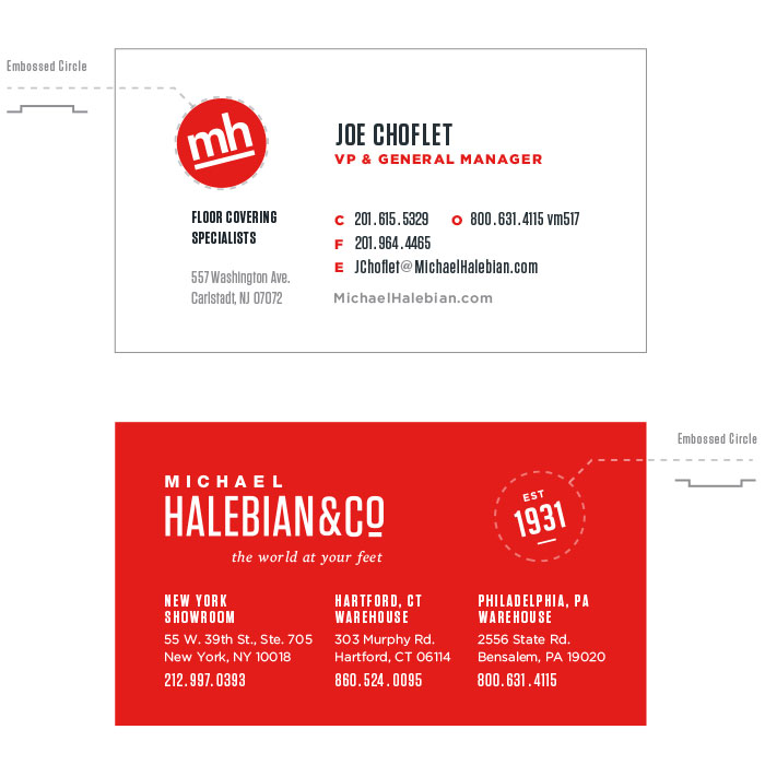 Option three uses an embossed circle to give a raised impression on the front of the card, and make the 'MH' icon really stand out. On the reverse side, 'EST 1931' would sit down in the debossed area with tagline, showroom and warehouse info sitting below.