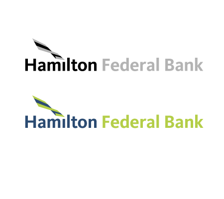 Using another typeface designed within the last decade, this time in a bolder fashion. We see a very warm, friendly and approachable company name, but the presence of the name is more primary in this logo (compared to option 4). The mark, designed to embody a flag, is shown marking the dot on the "i" in "Hamilton." The flag is sweeping upwards in an effort to connote the bank's forward-thinking strategy and ability to help its customers grow along with the bank. The three bands in the flag represent the bank, its customers, its services and the close relationship between the three.