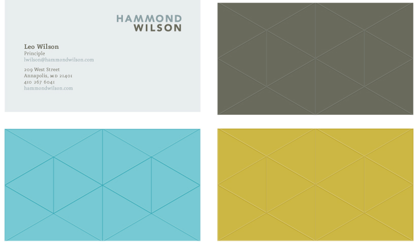 This card is also printed on light grey paper. The info side this time contains the logo, contact information, and tagline. This leaves the back side uncluttered. The pattern on the back is based on the proportion of the business card, as well as gables, or triangles, found in a good amount of the work Hammond Wilson does. This pattern is not printed with ink, but instead it is debossed, literally pressed into the paper, giving the card texture, and making the experience of holding the card more tactile and hands-on.