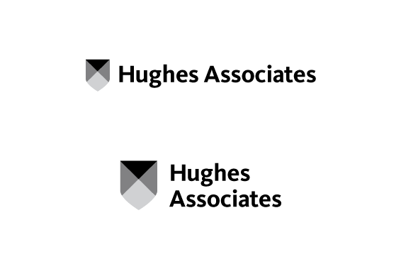 This logo is shown in two arrangements: linear and stacked. It could be used either way, given the space it needed to appear within. The mark is a faceted shield communicating protection and strength. The shield is rendered in a simple, forward-thinking fashion. Paired with a modern and clean type, this logo portrays Hughes as a contemporary entity. The various facets within the shield represent the multidisciplinary aspect of the company without being too specific or heavy-handed. This was done intentionally as a way of retaining the mark's relevance even as Hughes Associates grows and evolves.