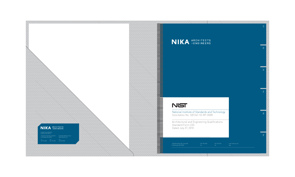 Inside Sales kit opens to a flood of metallic-silver ink. Pocket variation following the 45-degree angle made by the grid, and has a spot for the business card. Proposal sits on the right with a blue cover and blue tabs. Next